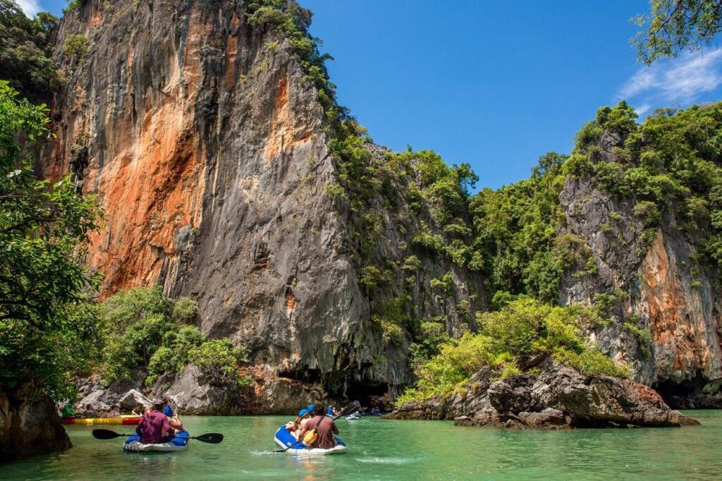 In contrast to Phi Phi’s lively atmosphere, Phang Nga Bay offers a calmer, more mysterious experience. Famous for its towering limestone karsts rising vertically from the sea, the bay feels almost otherworldly. Many visitors recognize James Bond Island, but the true magic lies in kayaking through hidden lagoons and sea caves accessible only at low tide.